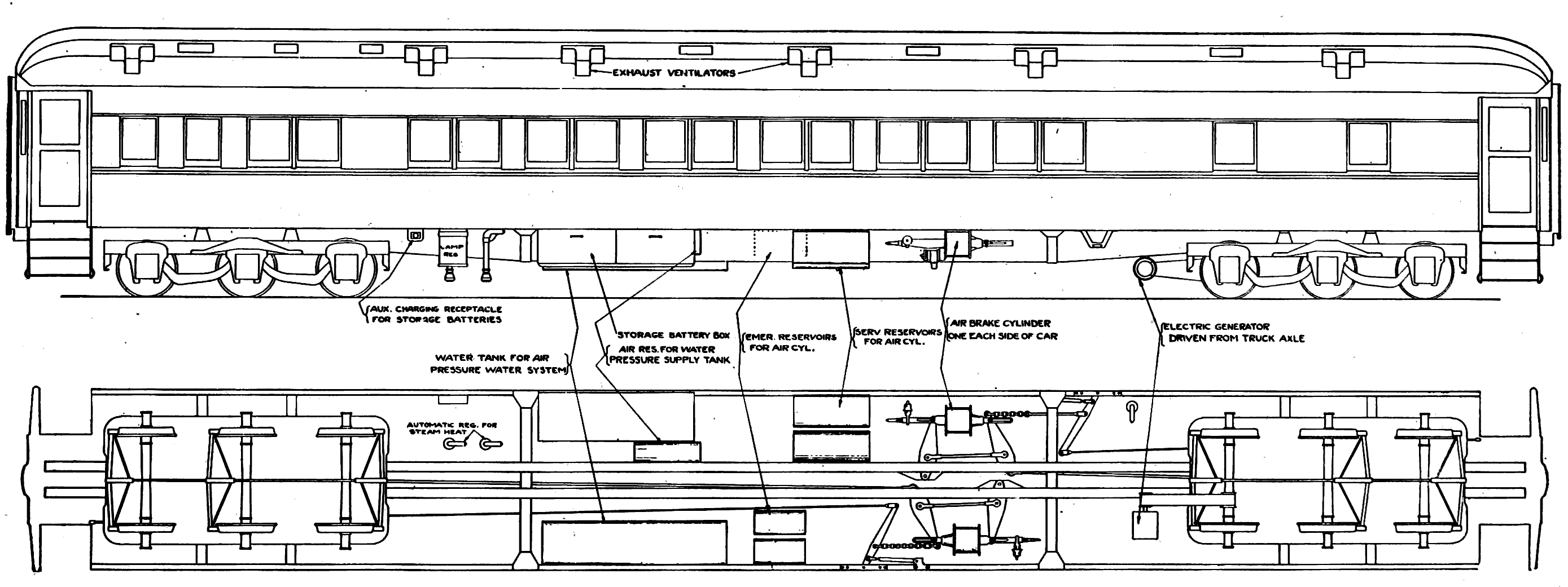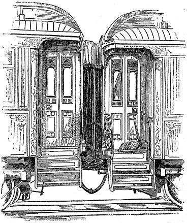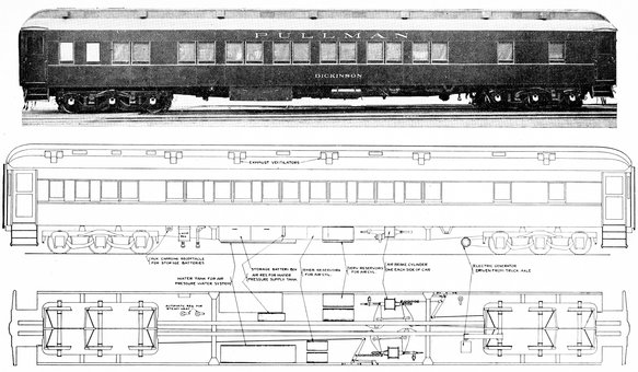 Pullman sleeping car, latest design, with outline drawing showing how the car is supplied with light, water, and heat