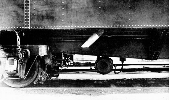 The trucks which carry this tremendous burden of steel are marvels of strength and efficiency. Each of the two trucks has six steel wheels weighing nine hundred pounds apiece. Added to this is the weight of the three six hundred pound axles, the two steel castings which form the framework for the trucks together with the bolsters, springs, equalizers, and brake equipment—a total weight of 42,000 pounds for the trucks alone, contributed to the total weight of the car.