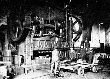 Another large press at work on the forming of steel shapes for the interior framing of the cars