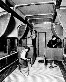 As a car-building material wood has had its day, and the concrete floor of the Pullman car is tacit tribute to the sanitary properties of a widely used material. On the floor of concrete the familiar green carpet is lightly stretched to be easily removed at the journey's end, and after the floor has been thoroughly scrubbed, returned after a complete cleansing with vacuum cleaners. Instead of insanitary woodwork, the smooth surfaces of steel which form the interior of the car offer no lurking place for germs, and soap and water at frequent and regular intervals maintain a high degree of cleanliness. Of course, the porter with his portable vacuum cleaners and his dustcloth, can keep the car tidy en route, but the real cleaning comes when the trip is over and a gang of professional workers with every appliance to serve this end attacks the cars. Then not only are the carpets renovated but the prying nozzles of powerful vacuum cleaners suck up every particle of dust from seats, berths and cushions. Each mattress is given similar treatment, and mattresses and pillows are hung in the open air for the action of that greatest of all purifiers, the sun. Blankets are given a similar treatment. Water coolers are cleaned and sterilized with steam. In fact, nothing that could harbor a speck of dust is neglected.