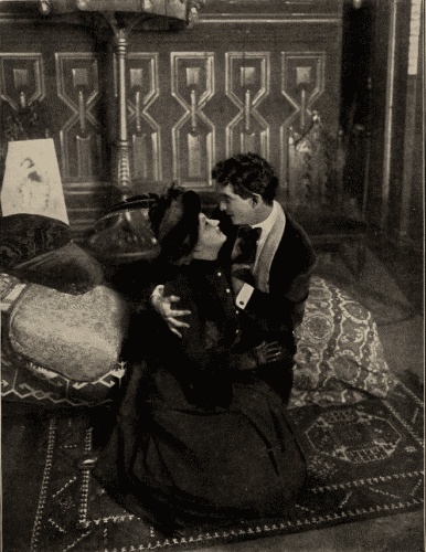 SCENE.—Room next to KARL'S studio. At the back of the stage to the L. is a glass door with portière towards the stage. When this door is opened one can see the studio. Bach of the stage to the R. a fireplace with burning fire. Round the fireplace an elevation about half a yard high reaching into the middle of the room. This elevation is bordered by a wooden railing with an opening on each side—in the middle of the railing an ancient Gothic chair, with back towards the public; the back of the chair must be so high that a person sitting in it cannot be seen by the public. On the R. a door leading into the entrance hall of the apartment. There is a little invisible door covered as the rest of the room, with wall paper, on the L. near the footlights. About a yard from this door, a settee with the head end towards the glass door of the studio. Next to this settee a small, ancient table, about one yard high. On the L. a curio cabinet (small); next to it a hall stand with some shawls of different colors. On L. next the settee a large, gilded, stand-up candelabra, as used in churches.