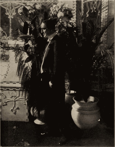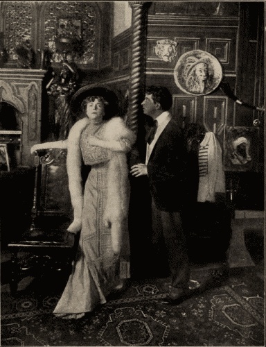 There are many sketches, framed and unframed, about the room—some statues, some heads, and a very elegant electric candelabra hanging in the middle of the room. The whole thing unharmonious but artistic. Down stage on the R. a medium-sized table littered with books, magazines and bric-à-brac; a large palette lies on the top of some books and scattered among the other things some tubes of paint and paint brushes.