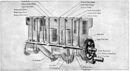 In timing the engine the points of opening and closing of the valves are, of course, what should be considered. As the valves are properly timed at the factory when the engine is built the necessity for retiming would occur only when such parts as the cam shaft, time gears or valves were removed in overhauling the engine.
