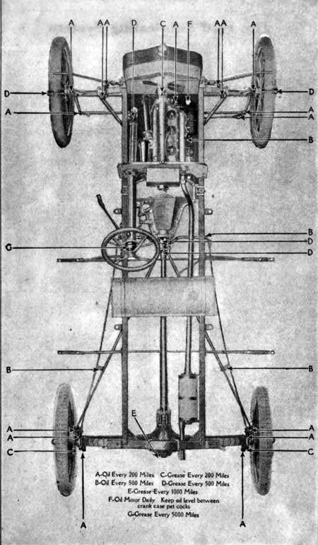 Remember that a new machine requires more careful attention during the first few days it is being driven than after the parts have become thoroughly "worked in." The car which is driven slowly and carefully when new usually gives the most satisfactory service in the end. Never start out with your car until you are sure that is has plenty of oil and water. Frequently inspect the running gear. See that no unnecessary play exists in either front or rear wheels, and that all bolts and nuts are tight. Make a practice of taking care of every repair or adjustment as soon as its necessity is discovered. This attention requires but little time and may avoid delay or possible accident on the road. We aim to deliver the car in proper mechanical adjustment. Afterwards it is plainly the duty of the driver to keep it in that condition.