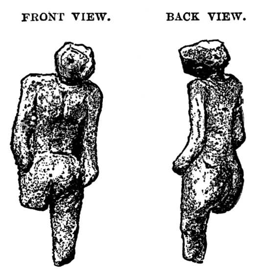 The Nampa image was brought up in boring an Artesian well, at Nampa in Ada county, Idaho, through a lava-cap 15 feet thick, and below it about 200 feet of the quicksands and clays of a silted-up lake, formed in a basin of the Snake river, which joins the Columbia river, and flows into the Pacific, forming part, therefore, of the same geographical and drainage system as the Californian gravels. At this depth the borers came down to a stratum of coarse sand, mixed with clay balls at the top, and resting at the bottom on an ancient vegetable soil, and the image came up from the lower part of this coarse sand. The borer, or liner of the well, was a six-inch iron tube, and the drill was only used in piercing the lava, while the sands below it were all extracted by a sand pump. Mr. King, a respectable citizen of Nampa, who was boring the well, states that he had 386 been for several days closely watching the progress of the well and passing through his hands the contents of the sand pump as they were brought up, so that he had hold of the image before he suspected what it was. Mr. Cumming, superintendent of that portion of the Union Pacific Railway, a highly-trained graduate of Harvard College, was on the ground next day and saw the image, and heard Mr. King's account of the discovery, and Mr. Adams, the president of the railway, happening to pass that way about a month later, he brought it to the notice of some of the foremost geologists in the United States. The image was sent to Boston by Mr. King, who gave every information, and it was found to be modelled from stiff clay, like that of the clay balls found in the sand, slightly if at all touched by fire, and incrusted like those balls with grains of oxide of iron, which Professor Putnam considers to be a conclusive proof of its great antiquity. Mr. Emmons, of the State Geological Society, gives it as his opinion that the strata in which this image is said to have been found, is older by far than any others in which human remains have been discovered, unless it be those under Table Mountain, in California, from which came the celebrated Calaveras skull. So much for the authenticity of the discovery, which seems unassailable, but now comes the remarkable feature of it, which to a great extent revolutionizes our conception of this early palæolithic age. The image, or rather statuette, which is scarcely an inch and a half long, is by no means a rude object, but on the contrary more artistic, and a better representation of the human form, than the little idols of many comparatively modern and civilized people, such as the Phœnicians. It is in fact very like the little statuettes so abundantly found 387 in the neighbourhood of the old temple-pyramids of Mexico, which are generally believed to be not much older than the date of the Spanish Conquest.