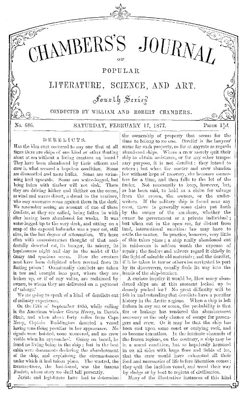 Has the idea ever occurred to any one that at all times there are ships of one kind or other floating about at sea without a living creature on board? They have been abandoned by their officers and crew in what seemed a hopeless condition. Some are dismantled and mere hulks. Some are swimming keel upwards. Some are water-logged, but being laden with timber will not sink. There they are driving hither and thither on the ocean, as wind and waves direct, a dread to the mariner, who may unawares come against them in the dark. We remember seeing an account of one of these derelicts, as they are called, being fallen in with after having been abandoned for weeks. It was water-logged up to the very deck, and sitting on a scrap of the exposed bulwarks was a poor cat, still alive, in the last degree of attenuation. We have often with commiseration thought of that accidentally deserted cat, its hunger, its misery, its hopelessness night and day in the midst of the dreary and spacious ocean. How the creature must have been delighted when rescued from its floating prison! Occasionally derelicts are taken in tow and brought into port, where they are broken up, or if of any value, are reclaimed by owners, to whom they are delivered on a payment of 'salvage.'