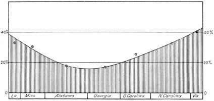 The significance of these figures is shown by transferring them to a diagram, given on Chart II, which indicates the average cloudiness prevailing over the several States where they are crossed by the track. The marked depression in the middle portions, especially over Alabama and Georgia, indicates that the stations in these districts make a much better showing than those nearer the coast line. The reasons for this difference are probably many in number, but the chief feature is that the interior of this region, especially over the higher lands of the southern reaches of the Appalachian Mountains, which are from six hundred to one thousand feet above the sea level, is somewhat freer from the moisture flowing inland from the ocean at that season of the year. The table shows also two divisions, one for the “general sky,” wherein the relative cloudiness was noted in every portion of the visible sky, and for the “sky near the sun,” where the observation was confined to the immediate vicinity of the sun. The two records agree almost exactly, except that the sky near the sun averages a little lower than the general sky. This indicates that although the sun will be seen in the morning hour of May 28th, when it is only from thirty to forty degrees above the horizon, yet this is not an unfavorable circumstance. The low altitude, on the other hand,5 makes it easier for those at the instruments to enjoy a more comfortable observing position than if it were nearer the zenith, where one must look directly upward. Of course, a storm of some kind may occur on that day to modify these general weather conditions and upset all calculations. While the cloud observations suggest that Georgia and Alabama have the best sites for the eclipse, it must be remembered that the duration is about one minute and twenty seconds in Alabama, and one minute and forty seconds in North Carolina. As a gain of twenty seconds in observing time will be considered by many of sufficient importance to take chances on the cloudiness, stations will be selected in North Carolina for that reason, although the probability for minimum cloudiness is twice as good in Georgia and Alabama. The table shows that the chances are only one to six against observers located in these States, while near the coast they are about two to six against them. On the whole, the general result is that observing in this region ought to be successful, because the favorable chances for good weather are above the average at that season of the year.