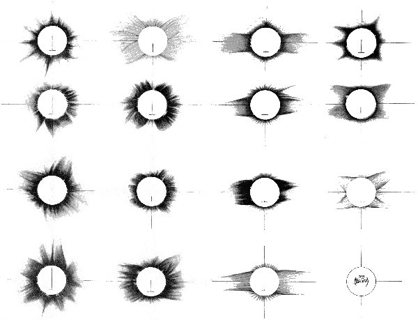 The coronas of the past forty years are shown on Chart III, taken from the report of the eclipse of 1896 (August 9th), by A. Hansky. It arranges the coronas in the eleven-year period so far as the dates at which the eclipses occurred permit this to be done, and by comparing them in vertical lines the similarity is at once seen for the respective quarters of phases of the period. The forecast there given for 1900 is seen to resemble 1867, 1878, and 1889, but it differs in orientation from that on Chart IV, which was prepared by the author. The four coronas on the left in Chart III are taken at the sun-spot maximum, and the appearance is that of total confusion in the structure of the rays; the second and the fourth columns are for the sun’s medium intensity at about halfway between the maximum and the minimum, and they show a system of polar rays taking on structural form, the second column being at a stage of diminishing and the fourth at one of increasing solar activity; the third column gives the corona when the spots are at a minimum of frequency and the sun is in a comparatively quiescent state, wherein the polar rifts are very distinct and the equatorial wings or extensions greatly developed.