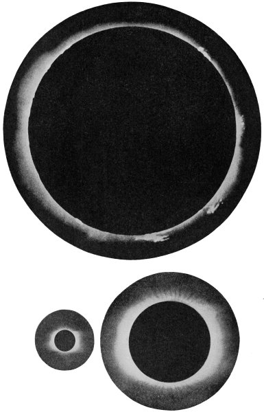 Of the two kinds of photographic plates, the wet and the dry, the dry plates are much more convenient in the field, and are good for certain purposes. The objections to them are that the rough granulations of the gelatin film sometimes overpower the fine details13 of the corona itself; they burn out very near the disk by over-exposure while the faint outer extensions are being taken. Wet plates having the requisite quickness are harder to prepare, but are smoother and hold the coronal rays better from the base to the outer edge, and there is always plenty of time to give the necessary exposure. The No. 26 Seed plate requires from 0.5 to14 2.0 seconds only, generally one second being about right; the wet plate will take the corona in eight seconds or less. The best time of exposure should be tested on a bright star of about the second magnitude, by trial before the eclipse. There is no rule about the photographic focus, except to discover it by a series of exposures at different distances near the supposed point. Eclipse work is a practical matter, and many rough-and-ready methods must necessarily be admitted. A good lens in a wooden light-tight tube, supported at each end, having the motion of the sun, the photographic focal plane carefully determined, the time exposures very short, and, finally, exceedingly slow development of the picture after the eclipse—these form the prime requisites. Expensive telescopes, clockwork on heavy iron piers, reflecting mirrors, and such like apparatus are not needed. Ingenuity in practical details, with great anxiety about the essential matter of the light itself, is what is needed for a successful eclipse expedition.