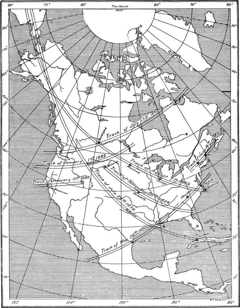 The tracks of the eight North American eclipses seen since 1800 are shown on Chart VI. It is noted that three have paths very similarly located, and that five run in directions about parallel to one another, but almost at right angles to the first group. This comprises the eclipse of November 30, 1834, duration two minutes; August 7, 1869, two minutes and three quarters; July 29, 1878, two minutes and a half, which stretch from Alaska southeastward in a fan-shape to the South Atlantic coast. The second group contains the tracks June 16, 1806, four minutes and a half; July 17, 1860, three minutes; January 11, 1880 thirty-two seconds; January 1, 1889, two minutes and a quarter; and May 28, 1900, two minutes. These tracks all trend from southwest to northeast, and cross the North American continent in different latitudes, that of May 28, 1900, being the most southerly and of rather short duration; lasting less than two minutes in the United States.