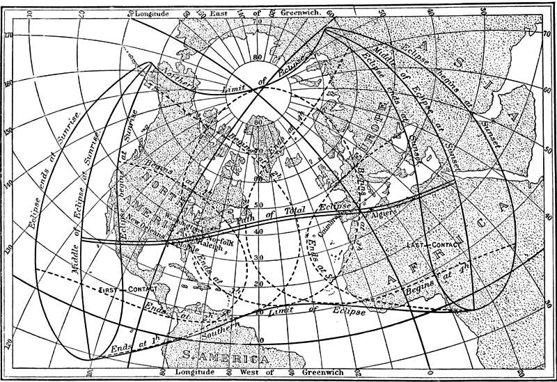 The mode of the formation of the shadow cones of the moon, called the penumbra for the partial shadow and the umbra for the total shadow, are well illustrated in general works on astronomy, and good geometrical pictures of them can there be found, together with much useful information regarding the subject of eclipses. As we are here concerned chiefly with certain practical points about the eclipse of 1900, it will be well for the reader to consult such works for many details regarding the astronomical features attending an eclipse of the sun which must now be omitted.