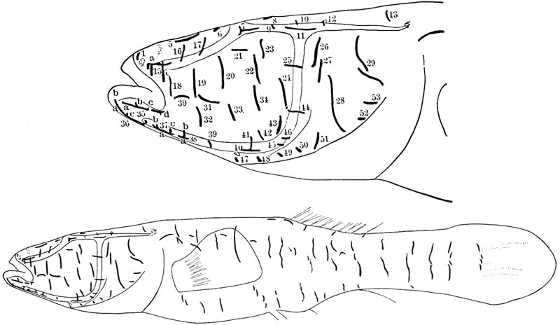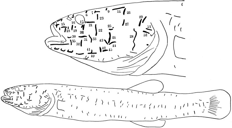 The fish called Lepidosiren (Lepidosiren paradoxica) is one of the only three still existing survivors of the once prominent group of Dipnoi, or lung fishes, which are characterized by the possession of well-developed lungs in addition to their gills. Mr. Graham Kerr, who spent several months in the swamps of the Gran Chaco, South America, a habitat of these fishes, describes them as living among the dense vegetation of the swamp, swimming in eel fashion, or clambering through the mass of vegetation by means of their leglike limbs. In the dry season they retire into the mud, and breathe entirely by means of their lungs. When the wet season begins they are set free, and at once prepare to spawn. They lay their eggs in burrows at the bottom of the swamp, where the eggs develop into larvæ. The phenomena of their development are of special interest, because it takes place in seclusion, away from the disturbing features due to adaptation to varied surroundings. It has been discovered that the young lepidosirens become white and transparent during the hours of darkness.