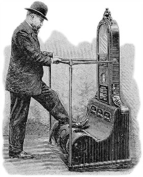“A Mechanical Bootblack.”—A bootblacking apparatus is one of the latest developments of the nickel-in-the-slot machine, a specimen of which is undergoing trial in a French public garden. The customer drops his coin—in the present case a ten centime, or a two-and-a-half-cent piece—into the receptacle, which opens the way to a compartment where a brush cleans his boots; he next puts his feet into a second compartment and has them blackened; and then into a third, where they are polished. The operation takes about a minute and a half, and during the time the customer may watch the indications of its progress as they are shown upon the dial. The machinery working in the inside is very simple. An electric motor of small power—about eighteen kilogrammetres per second—controls the shaft on which the three rotary brushes are fixed, and the customer has only to unlock the machine, the same as all others of its kind, with his coin, and move the handle which opens the circuit and starts the motion. A representation of the machine at work is given in the accompanying illustration, for which we are indebted to La Nature.