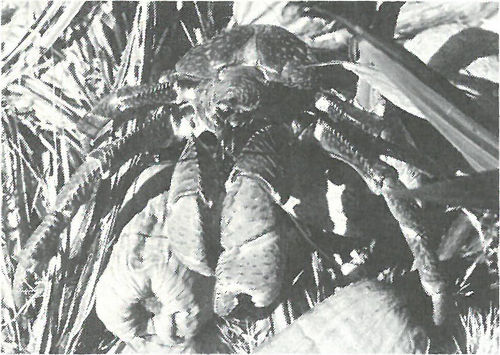 This Pacific Ocean coconut crab, member of a family that usually sticks to tide-covered beaches, depends on coconut trees for its food.