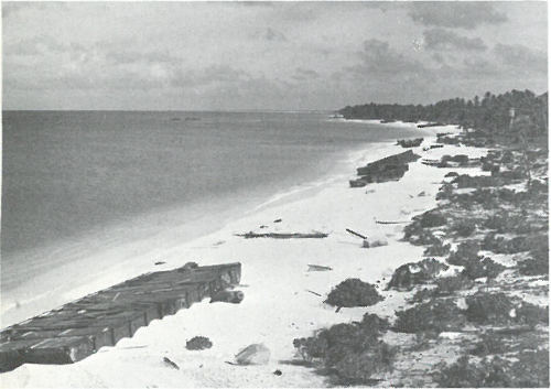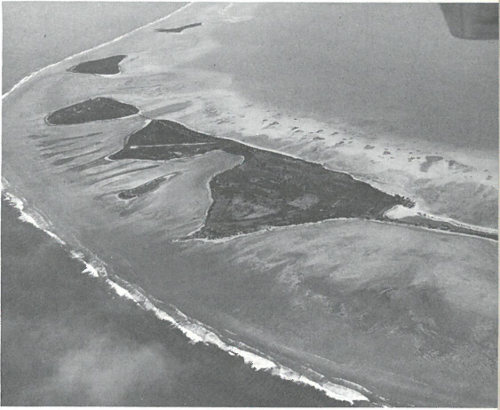 Islands on the rim of Eniwetok Atoll, as they appear today. The marks of man, such as a landing strip, are visible, but regrowth of vegetation is apparent. Note extent of the reef on both sides of islands.