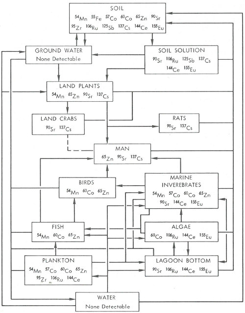 Distribution of fallout radioisotopes on Rongelap Atoll as determined by a survey in 1961. Note the interrelationships of man, plants, animals and the environment.