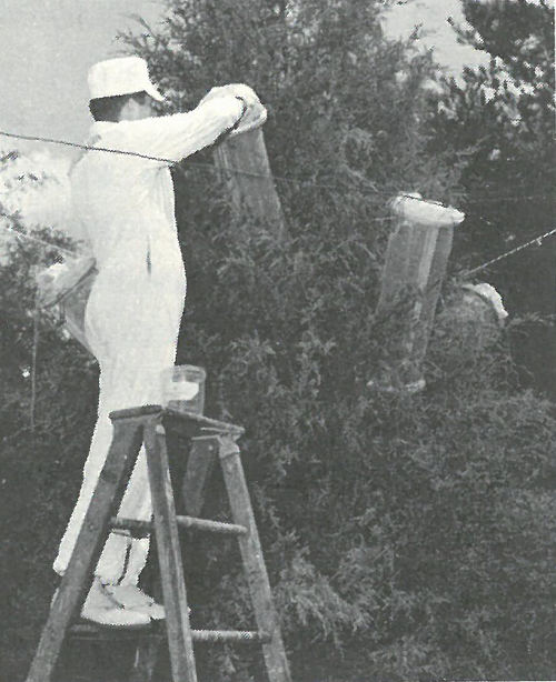 Mud-dauber wasps, building nests of radioactive mud in a waste disposal area near an Oak Ridge, Tennessee, atomic plant, are the object of intensive environmental radiation study. A shows radioactivity reading from a nest. B is an enlarged view of the nest with two tiny dosimeters in place to measure radiation. In C an ecologist inspects new nests built in a laboratory flight cage from radioactive mud provided in pans at the bottom. In D wasps are anesthetized, marked with tiny plastic disks for future identification, and released.