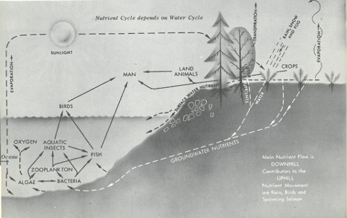 Movement of radioactive elements in a forest-lake ecological system. Most nutrient-flow is “downhill”, but birds, migrating fish, and the evaporation-rainfall cycle may move them “uphill”.