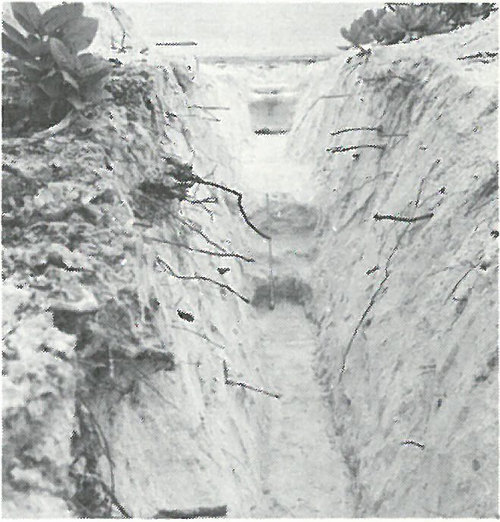 Trench dug on Rongelap Island to expose soil strata and root systems to determine penetration of radionuclides in coral-sand “topsoil”.