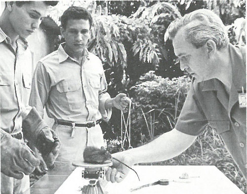 A native rat, captured alive on Engebi Island, being held by a scientist before having its toenails clipped as a means of identification. Note the animal’s healthy appearance.