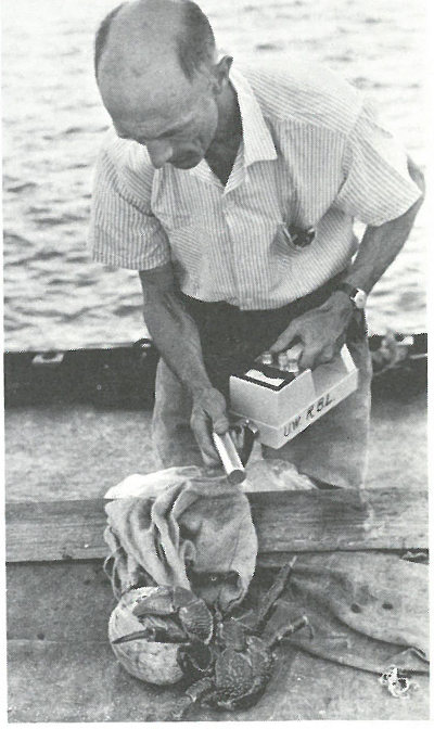 COCONUT CRAB. Measuring the radioactivity of the shell of a coconut crab caught on Bikini Island.