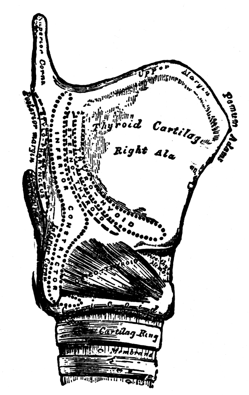 The larynx is the principal organ of voice. It is situated in the front of the neck, and forms the prominence sometimes called “Adam’s apple”; it also forms a part of the anterior boundary of the pharynx. At the upper part it has the form of a triangular box, with one angle directly in front. It is composed of nine cartilages moved by muscles, and lined with mucous membrane. Six of its cartilages are in pairs; three are single. The three single cartilages are the thyroid, cricoid, and epiglottis; the three pairs are the arytenoid, cuneiform, and cornicula laryngis. The larynx is sometimes called a music-box; from it proceeds the sound called voice.