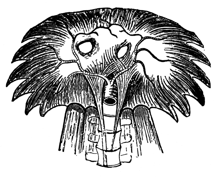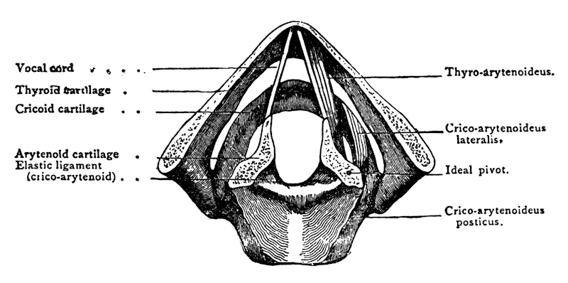 By means of the action of the muscles of the larynx that connect with the cartilages which enter into its structure, the vocal cords are so adjusted that when the muscles of expiration force the air, which is compressed in the lungs, out between these cords, their edges are set in vibration. This is the beginning of the sound which we call voice, but before it is heard in speech or song it is reinforced by the chambers of resonance.[1]