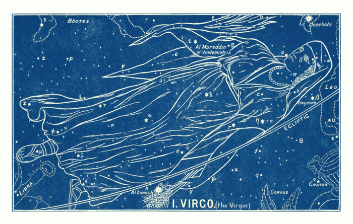 Beginning, then, with Virgo, let us now spread out the contents of this Heavenly Volume, so that the eye can take them in at a glance. Of course we are greatly hindered in this, in having to use the modern Latin names which the Constellations bear to-day.19 Some of these names are mistakes, others are gross perversions of the truth, as proved by the pictures themselves, which are far more ancient, and have come down to us from primitive times.