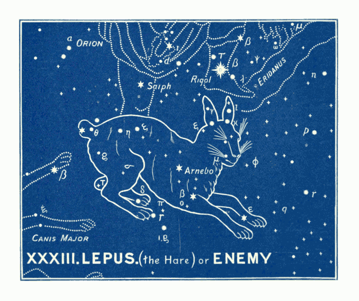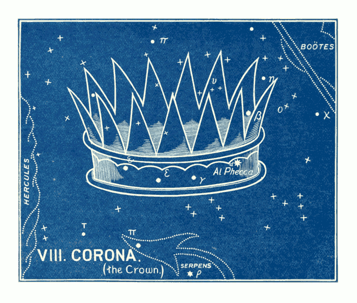 The constellation of the Canes Venatici (the Greyhounds), i.e., the two dogs (Asterion and Chara), which Boötes holds by a leash, is quite a modern invention, being added by Hevelius (1611-1687). The bright star of the 3rd magnitude in the neck of Chara, was named “Cor Caroli” (the heart of Charles) by Sir Charles Scarborough, physician to Charles II., in honour of Charles I., in 1649. This is a good example of the almost infinite distance between the ancient and modern names. The former are full of mysterious significance and grandeur, while the latter are puerile in the extreme, almost approaching to the comic! e.g., the Air Pump, the Painter's Easel, the Telescope, the Triangle, the Fly, the Microscope, the Indian, the Fox and Goose, the Balloon, the Toucan (or American Goose), the Compasses, Charles's Oak, the Cat, the Clock, the Unicorn, &c. The vast difference can be at once seen between those designed by the ancients and those added by astronomers in more recent times.