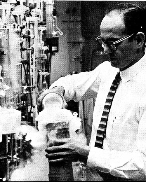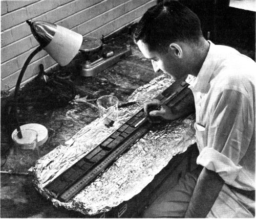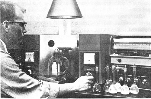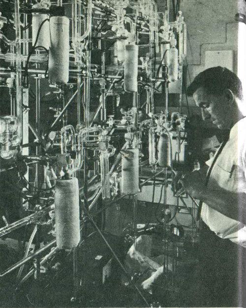 U. S. Geological Survey scientists prepare acetylene gas, made from the carbon-14 in a geological specimen, in a vacuum line. This gas will be fed into a proportional counter to determine the age of the specimen by its ¹⁴C count. (See “Carbon-14 Counting” beginning on page 12.)