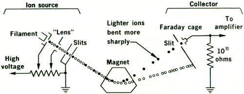 Not much progress was made for about 30 years until A. O. C. Nier, a Harvard University physicist, perfected an instrument called a MASS SPECTROMETER (to be described later) just before World War II. The rapid technological advances of the war years followed. The Manhattan Project[3] made the atomic bombs that ended the fighting; it also developed new scientific techniques that could be applied, when peace returned, to the measurement of geologic time.