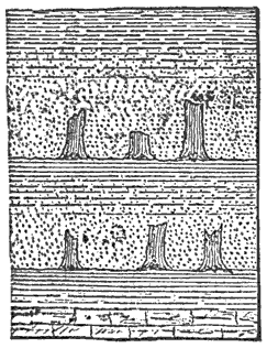 It is important to observe that an abundance of organic matter decaying under water is not the only condition essential to the formation of beds of coal and bitumen; for this condition is realized in the luxuriant growth of sea-weeds fringing the coast in every quarter of the globe; and yet coals and bitumens are rarely of sea-shore origin. These organic products, even under the most favorable circumstances, accumulate with extreme slowness; far more slowly, as a rule, than the ordinary mechanical sediments, like sand and clay, with which they are mixed, and in which they are often completely lost. Consequently, although the deposition of the carbonized remains of plants and animals is taking place in nearly all seas, lakes, and marshes, it is only in those places where there is little or no mechanical sediment that they can predominate so as to build up beds pure enough to be called coal or bitumen. In all other cases we get merely more or less carbonaceous sand or clay. Now these especially favorable localities will manifestly not be often found along the seashore, where we have strewn the sand and clay brought down by rivers or washed off the land directly by the ever-active surf; but they must exist in the central portions of the ocean, where there is almost no mechanical sediment and yet an abundance of life, and in swamps and marshes, where there is scarcely sufficient water to cover the vegetation, and no waves or currents to wash down the soil from the surrounding hills.