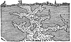 Formation of Iron-ores.—The iron-ores are another class of rocks which are formed only through the agency of organic matter. Iron is an abundant and wide-spread element in the earth’s crust, and, but for the intervention of life, we might say that, while there is iron everywhere, there is not much of it in any one place, since it is originally very thinly diffused. All rocks and soils contain iron, but it is mainly in the form of the peroxide, in which state it is entirely insoluble, and hence cannot be soaked out of the soil by the rain-water and concentrated by the evaporation of the water at lower levels in ponds and marshes, as a soluble substance like salt would be. If carried off with the sand and clay, by the mechanical action of water, it remains uniformly mixed with them, and there is no tendency to its separation and concentration so as to form a true iron-ore.