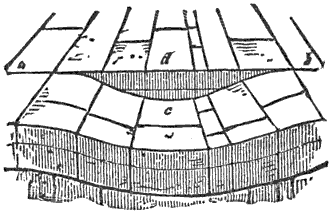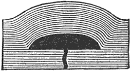 3. The concentric joints of granitic rocks.—In quarries of granite and other massive crystalline rocks, it is often very noticeable that the rock is divided into more or less regular layers by cracks which are approximately parallel with the surface of the ground, some of the granite hills having thus a structure resembling that of an onion. The layers are thin near the surface, become thicker and less distinct downwards, and cannot usually be traced below a depth of fifty or sixty feet. These concentric cracks are of great assistance in quarrying, and are now regarded as due to the expansion of the superficial portions of the granite caused by the heat of the sun. In reference to this view of their origin these may be properly called expansion joints.