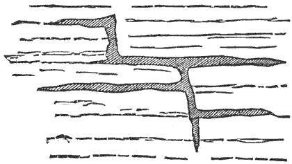 Transverse sections, such as are represented by Fig. 28 and many specimens and models, do not give the complete plan or idea of a fault; but this is seen more perfectly in Fig. 30. We learn from this that a typical fault is a fracture along which the strata have sagged or settled down unequally. The most important point to be observed here is that the strata do not drop bodily, but are merely bent, the throw being greatest at the middle of the fault and gradually diminishing toward the ends. In other words, every simple fault must die out gradually; for we cannot conceive of a fault as ending abruptly, except where it turns upon itself so as to completely enclose a block of the strata, which may drop down bodily; but the fault is then really endless. A fault may be represented on a map by a line; if a simple fault, by a single straight line. But faults are often compound, and are represented by branching lines; that is, the earth’s crust has been broken irregularly, and the parts adjoining the fracture have sagged or risen unequally.