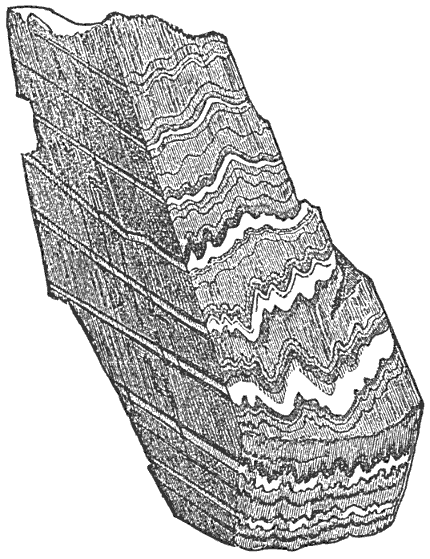 The principal characteristics of lithologic cleavage are: (1) It is rare, except in fine-grained, soft rocks, having its best development in the slates, roofing slates and school slates affording typical examples. Hence it is commonly known as slaty cleavage. (2) The cleavage planes are highly inclined or vertical, very constant in dip and strike, and quite independent of stratification. (3) It is usually associated with folded strata, and often with distorted nodules or fossils. The more important of these characteristics are illustrated by Fig. 27. This represents a block of contorted strata in which the dark layers are slate with very perfect cleavage parallel to the left-hand shaded side of the block; while the white layers are sandstone and quite destitute of cleavage. Many explanations of this interesting structure have been proposed, but that first advanced by Sharpe may be regarded as fully established. He said that slaty cleavage is always due to powerful pressure at right angles to the planes of cleavage. All the characteristics of cleavage noted above are in harmony with this theory. Cleavage is limited to fine-grained or soft rocks, because these alone can be modified internally by pressure, without rupture. Harder and more rigid rocks may be bent or broken, but they appear insusceptible of minute wrinkling or other change of structure affecting every particle of the mass. Since the cleavage planes are normally vertical, the pressure, according to the theory, must be horizontal. That this horizontal pressure exists and is adequate in direction and amount, is proved by the folds and contortions of the cleaved strata; for, as shown in Fig. 27, the cleavage planes coincide with the strike of the foldings, and are thus perpendicular to the pressure horizontally as well as vertically. The distortion of the fossils in cleaved slates is plainly due to pressure at right angles to the cleavage, for they are compressed or shortened in that direction, and extended or flattened out in the planes of cleavage. Again, Tyndall has shown that the magnetism of cleaved slate proves that it has been powerfully compressed perpendicularly to the cleavage. And, finally, repeated experiments by Sorby and others have proved that a very perfect cleavage may be developed in clay (unconsolidated slate) by compression, the planes of cleavage being at right angles to the line of pressure. When, however, Sharpe’s theory had been thus fully demonstrated, the question as to how pressure produces cleavage still remained unanswered. Sorby held that clay contains foreign particles with unequal axes, such as mica-scales, etc., and that these are turned by the pressure so as to lie in parallel planes perpendicular to its line of action, thus producing easy splitting or cleavage in those planes. And he proved by experiments that a mixture of clay and mica-scales does behave in this way. But Tyndall showed that the cleavage is more perfect just in proportion as the clay is free from foreign particles, and in such a perfectly homogeneous substance as beeswax, he developed a more perfect cleavage than is possible in clay. His theory, which is now universally accepted, is, that the clay itself is composed of grains which are flattened by pressure, the granular structure with irregular fracture in all directions, changing to a scaly structure with very easy and plane fracture or splitting in one definite direction.