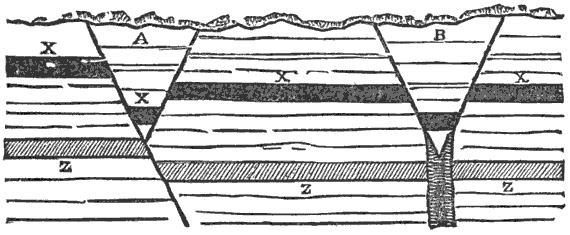 The usual explanation of normal faults is given in Fig. 31. The inclined fractures of the earth’s crust must often be converging, bounding, or enclosing large V-shaped blocks (A, B). If now, through any cause, as the folding of the strata, they are brought into a state of tension, so that the fractures are widened, the V-shaped masses, being unsupported, settle down, the fractures bounding them becoming normal faults, as is seen by tracing the bed X through the dislocations. The single fracture below the block A is inclined, and the stretching has been accomplished by slipping along it and faulting the bed Z as well as X, the entire section to the right of this fracture being part of a much larger V-shaped block the right-hand boundary of which is not seen. But the united fracture below the block B being vertical, any horizontal movement must widen it into a fissure, which is kept open by the great wedge above and may become the seat of a dike or mineral vein. The beds below the V may, in this case, escape dislocation, as is seen by tracing the bed Z across the fissure. These pairs of converging normal faults are called trough faults; and this is the only way in which we can conceive of important faults as terminating at moderate depths below the surface, and not affecting the entire thickness of the earth’s crust.