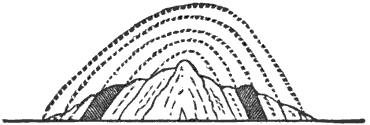 The folds or undulations of the strata may be profitably compared with water-waves. In fact, the comparison is so close that they have been not inaptly called rock-waves. Folds, like waves, unless very large, rarely continue for any great distance, but die out and are replaced by others, giving rise to the en echelon or step-like arrangement. The plan of both a wave and a fold is a more or less elongated ellipse, each stratum in a fold being semi-ellipsoidal or boat-shaped. In other words, a normal fold is an elongated mound of concentric strata, being highest at the centre, sloping very gradually toward the ends, and much more abruptly toward the sides.