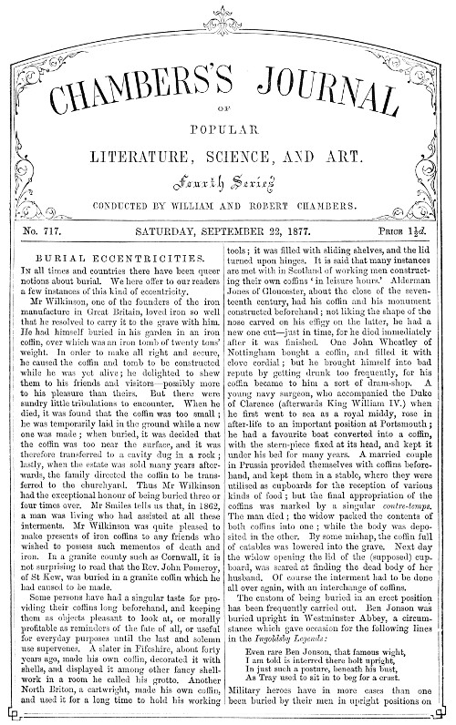 Mr Wilkinson, one of the founders of the iron manufacture in Great Britain, loved iron so well that he resolved to carry it to the grave with him. He had himself buried in his garden in an iron coffin, over which was an iron tomb of twenty tons' weight. In order to make all right and secure, he caused the coffin and tomb to be constructed while he was yet alive; he delighted to shew them to his friends and visitors—possibly more to his pleasure than theirs. But there were sundry little tribulations to encounter. When he died, it was found that the coffin was too small; he was temporarily laid in the ground while a new one was made; when buried, it was decided that the coffin was too near the surface, and it was therefore transferred to a cavity dug in a rock; lastly, when the estate was sold many years afterwards, the family directed the coffin to be transferred to the churchyard. Thus Mr Wilkinson had the exceptional honour of being buried three or four times over. Mr Smiles tells us that, in 1862, a man was living who had assisted at all these interments. Mr Wilkinson was quite pleased to make presents of iron coffins to any friends who wished to possess such mementos of death and iron. In a granite county such as Cornwall, it is not surprising to read that the Rev. John Pomeroy, of St Kew, was buried in a granite coffin which he had caused to be made.
