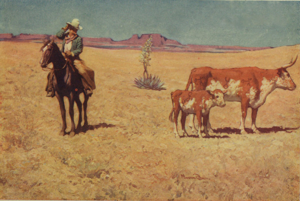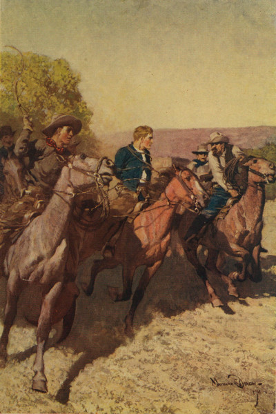 A rapt silence, such as artists love, followed the last wailing cadence of the song; the stillness of the desert crept in upon them, broken only by the murmur of the river and an almost subterranean thud of hoofs; then with a jingle of spurs and the creaking of wet leather a horseman rode up and halted before the door. The water sloshed in his boots as he dismounted but he swung into the store with the grace of a cavalier—a young man, almost a boy, yet broad-shouldered and muscular, with features moulded to an expression of singular resolution and courage. A heavy pair of apron chaps—sure sign of Texas—cumbered his limbs and the wooden handle of a Colts forty-five showed above its holster in the right leg; for the rest, he wore a new jumper over his blue shirt, and a broad, high-crowned hat, without [Pg 16] frills. As the stranger headed for the bar with business-like directness Angevine Thorne felt a sudden sense of awe, almost of fear, and he wondered for the instant if it was a hold-up; but the Texan simply dropped a quarter on the counter and motioned to a bottle.