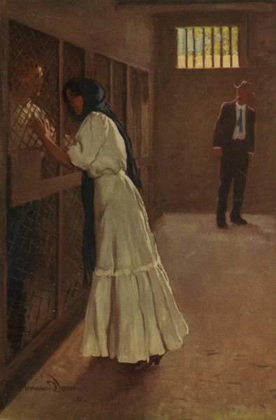 It would be difficult to tell just how it happened so, but as Pecos Dalhart, with a firm resolve in his heart, dashed down the steps once more, his eye caught a darker shadow in the dusky corner of the jail and he stopped dead in his tracks. Then as his vision became adjusted to the twilight he walked slowly over toward the corner, where a woman's figure [Pg 367] was crouched against the wall. It was Marcelina, worn, draggled, and tear-stained, and as she gazed up at him from beneath her tangled hair his heart stopped in its beat.