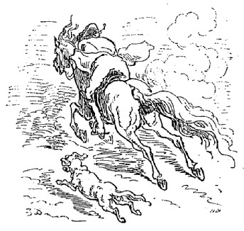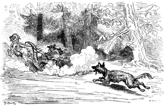 Je ne sais plus au juste si c'était en Esthonie ou en Ingrie, mais je me souviens encore parfaitement que c'était au milieu d'une effroyable forêt, que je me vis poursuivi par un énorme loup, rendu plus rapide encore par l'aiguillon de la faim. Il m'eut bientôt rejoint; il n'était plus possible de lui échapper: je m'étendis machinalement au fond du traîneau, et laissai mon cheval se tirer d'affaire et agir au mieux de mes intérêts. Il arriva ce que je présumais, mais que je n'osais espérer. Le loup, sans s'inquiéter de mon faible individu, sauta par-dessus moi, tomba furieux sur le cheval, déchira et dévora d'un seul coup tout l'arrière-train de la pauvre bête, qui, poussée par la terreur et la douleur, n'en courut que plus vite encore. J'étais sauvé! Je relevai furtivement la tête, et je vis que le loup s'était fait jour à travers le cheval à mesure qu'il le mangeait: l'occasion était trop belle pour la laisser échapper; je ne lis ni une ni deux, je saisis mon fouet, et je me mis à cingler le loup de toutes mes forces: ce dessert inattendu ne lui causa pas une médiocre frayeur; il s'élança en avant de toute sa vitesse, le cadavre de mon cheval tomba à terre et—voyez la chose étrange!—mon loup se trouva engagé à sa place dans le harnais. De mon côté, je n'en fouettai que de plus belle, de sorte que, courant de ce train-là, nous ne tardâmes pas à atteindre sains et saufs Saint-Pétersbourg, contre notre attente respective, et au grand étonnement des passants.