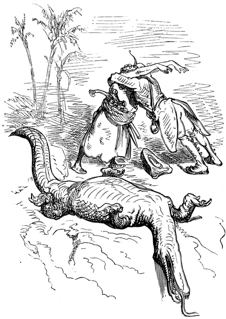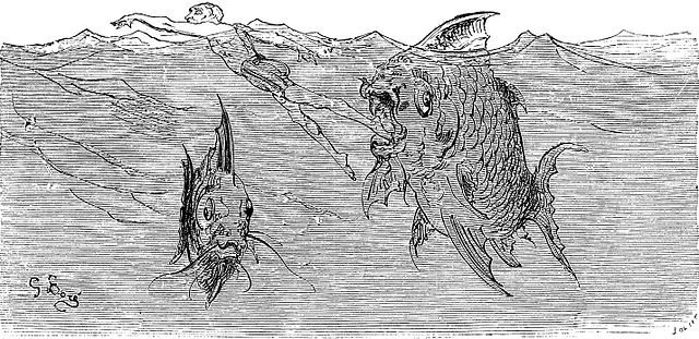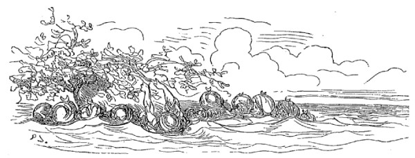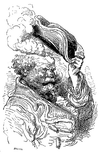Quand nous eûmes erré trois jours durant, Dieu sait où,—car nous manquions toujours de boussole,—nous arrivâmes dans une mer qui semblait toute noire: nous goûtâmes ce que nous prenions pour de l'eau sale, et nous reconnûmes que c'était de l'excellent vin! Nous eûmes toutes les peines du monde à empêcher nos matelots de se griser. Mais notre joie ne fut pas de longue durée, car, quelques heures après, nous nous trouvâmes entourés de baleines et d'autres poissons non moins gigantesques: il y en avait un d'une longueur si prodigieuse que même avec une lunette d'approche nous n'en pûmes voir le bout. Malheureusement nous n'aperçûmes le monstre qu'au moment où il était tout près de nous: il avala d'un trait notre bâtiment avec ses mâts dressés et toutes ses voiles dehors.