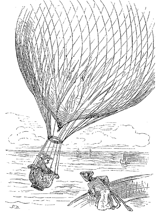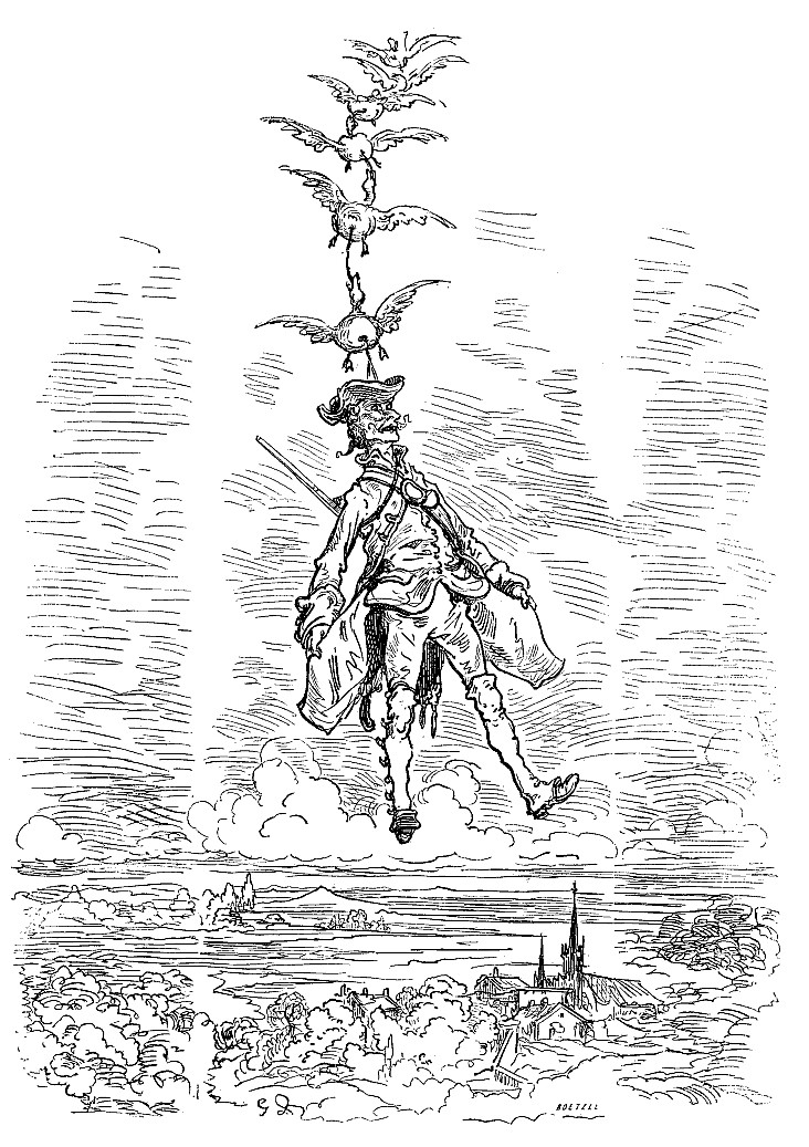 Comme j'avais encore un bon bout de chemin à faire, et que cette quantité de canards m'incommodait singulièrement, je commençai à regretter d'en avoir tant pris. Mais sur ces entrefaites il survint un événement qui, au premier moment, me causa quelque inquiétude. Les canards étaient encore tous vivants: revenus peu à peu de leur premier étourdissement, ils se mirent à battre de l'aile et à m'enlever en l'air avec eux. Tout autre que moi eût assurément été fort embarrassé. Mais moi j'utilisai cette circonstance à mon profit, et, me servant des basques de mon habit comme de rames, je me guidai vers ma demeure. Arrivé au-dessus de la maison, lorsqu'il s'agit de parvenir à terre sans me rien casser, je tordis successivement le cou à mes canards, et je descendis par le tuyau de la cheminée, et, à la grande stupéfaction de mon cuisinier, je tombai sur le fourneau qui par bonheur n'était pas allumé.