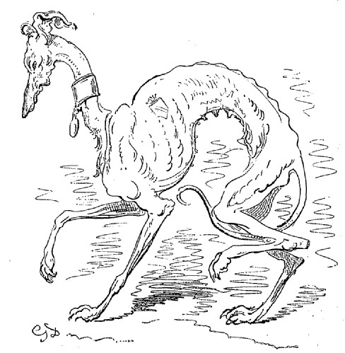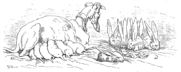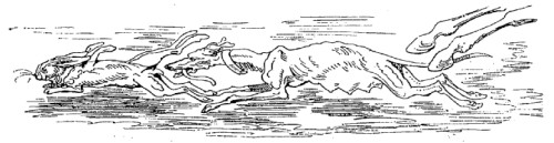 Alors que cette intéressante bête était encore lévrier ou, pour parler plus exactement, levrette, elle lit lever un lièvre qui me parut extraordinairement gros. Ma chienne était pleine à ce moment, et cela me peinait de voir les efforts qu'elle faisait pour courir aussi vite que d'habitude. Tout à coup j'entendis des jappements, comme si c'eût été une meute entière qui les poussât, mais faibles et incertains, si bien que je ne savais d'où cela partait: lorsque je me fus approché, je vis la chose la plus surprenante du monde.