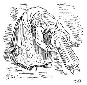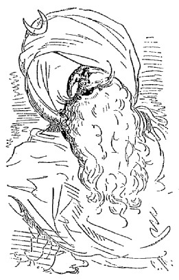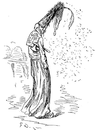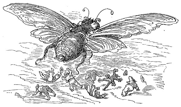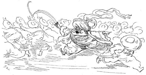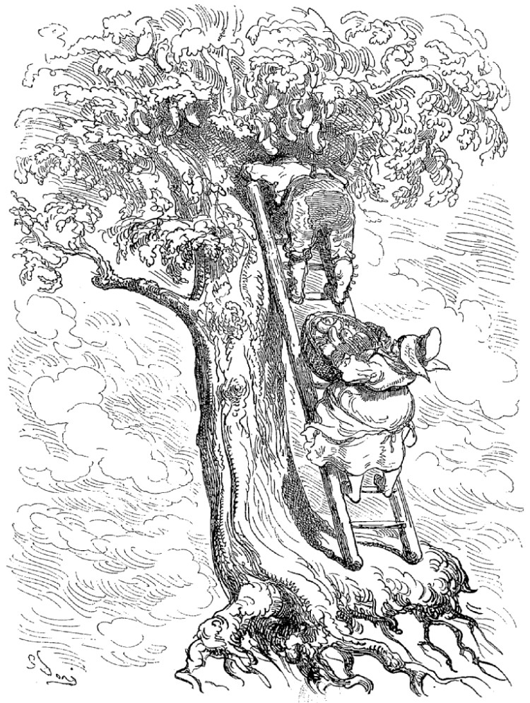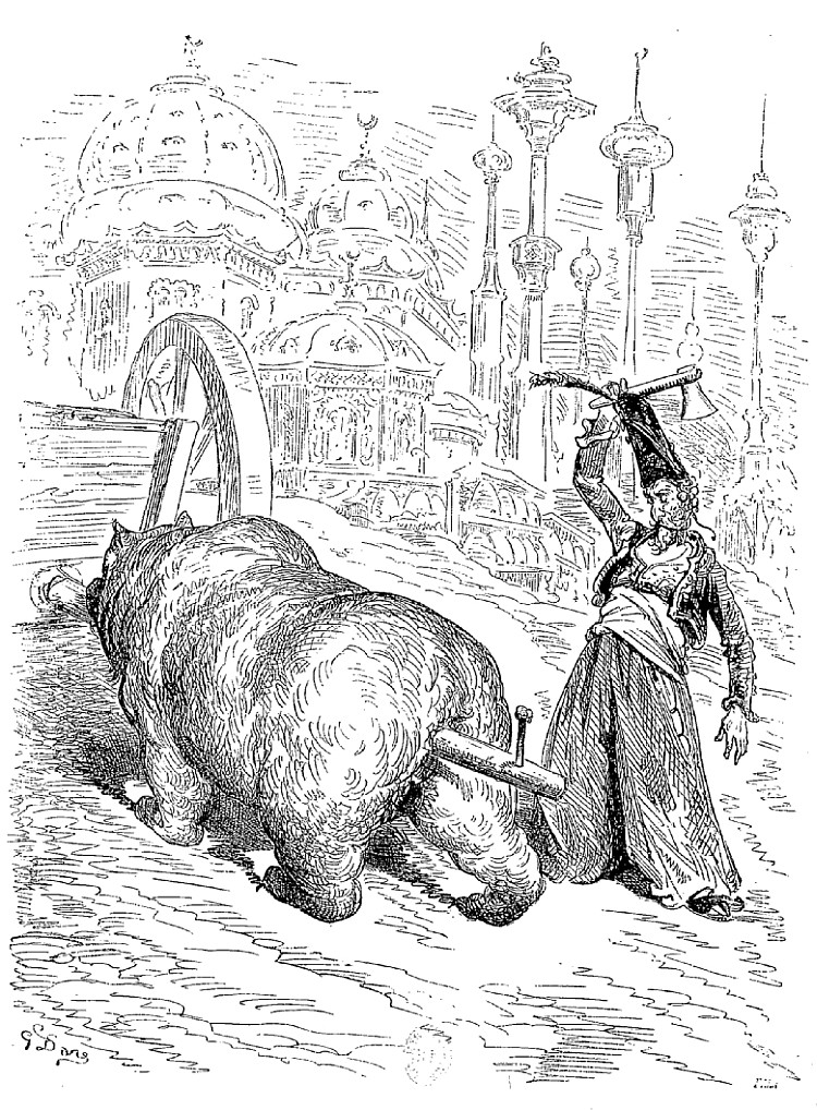 N'ayant entre les mains d'autre arme que la hachette d'argent qui est le signe distinctif des jardiniers et des laboureurs du sultan, je la lançai contre les deux voleurs, dans le but de les effrayer. Je réussis en effet à délivrer la pauvre abeille; mais l'impulsion donnée par mon bras avait été trop forte; la hache s'éleva en l'air si haut, si haut, qu'elle s'en alla tomber dans la lune. Comment la ravoir? Où trouver une échelle pour aller la rechercher?