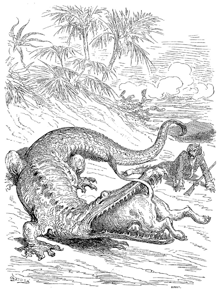 Les Aventures du baron de Münchhausen jouissent en Allemagne d'une célébrité populaire qu'elles ne sauraient manquer, nous l'espérons du moins, d'acquérir bientôt en France, malgré leur forte saveur germanique, et peut-être à cause même de cela: le génie des peuples se révèle surtout dans la plaisanterie. Comme les œuvres sérieuses chez toutes les nations ont pour but la recherche du beau qui est un de sa nature, elles se ressemblent nécessairement davantage, et portent moins nettement imprimé le cachet de l'individualité ethnographique. Le comique, au contraire, consistant dans une déviation plus ou moins accentuée du modèle idéal, offre une multiplicité singulière de ressources: car il y a mille façons de ne pas se conformer à l'archétype. La gaieté française n'a aucun rapport avec l'humour britannique; le witz allemand diffère de la bouffonnerie italienne, et le caractère de chaque nationalité s'y montre dans son libre épanchement. Le baron de Münchhausen, en dépit de ses hâbleries incroyables, n'a nul lien de parenté avec le baron de Crac, autre illustre menteur. La blague française, qu'on nous pardonne d'employer ce mot, lance sa fusée, pétille et mousse comme du vin de Champagne, mais bientôt elle s'éteint, laissant à peine au tond de la coupe deux ou trois perles de liqueur. Cela serait trop léger pour des gosiers allemands habitués aux fortes bières et aux après vins du Rhin: il leur faut quelque chose de plus substantiel, de plus épais, de plus capiteux. La plaisanterie, pour faire impression sur ces cerveaux pleins d'abstractions, de rêves et de fumée, a besoin de se faire un peu lourde; il faut qu'elle insiste, qu'elle revienne à la charge, et ne se contente pas de demi-mots qui ne seraient pas compris. Le point de départ de la plaisanterie allemande est cherché, peu naturel, d'une bizarrerie compliquée, et demande beaucoup d'explications préalables assez laborieuses; mais la chose une fois posée, vous entrez dans un monde étrange, grimaçant, fantasque, d'une originalité chimérique dont vous n'aviez aucune idée. C'est la logique de l'absurde poursuivie avec une outrance qui ne recule devant rien. Des détails d'une vérité étonnante, des raisons de l'ingéniosité la plus subtile, de attestations scientifiques d'un sérieux parfait servent à rendre probable l'impossible. Sans doute, on n'arrive pas à croire les récits du baron de Münchhausen, mais à peine a-t-on entendu deux ou trois de ses aventures de terre ou de mer, qu'on se laisse aller à la candeur honnête et minutieuse de ce style, qui ne serait pas autre, s'il avait à raconter une histoire vraie. Les inventions les plus monstrueusement extravagantes prennent un certain air de vraisemblance, déduites avec cette tranquillité naïve et cet aplomb parfait. La connexion intime de ces mensonges qui s'enchaînent si naturellement les uns aux autres finit par détruire chez le lecteur le sentiment de la réalité, et l'harmonie du faux y est poussée si loin qu'elle produit une illusion relative semblable à celle que font éprouver les voyages de Gulliver à Lilliput et à Brobdignag, ou bien encore l'Histoire véritable de Lucien, type antique de ces récits fabuleux tant de fois imités depuis. Ici, le crayon de Gustave Doré augmente encore le prestige; personne mieux que cet artiste, qui semble avoir cet œil visionnaire dont parle Victor Hugo dans sa pièce à Albert Durer, ne sait faire vivre d'une vie mystérieuse et profonde les chimères, les rêves, les cauchemars, les formes insaisissables noyées de lumière et d'ombre, les silhouettes drôlatiquement caricaturales, et tous les monstres de la fantaisie; il a commenté les aventures du baron de Münchhausen de dessins qui semblent les planches d'un voyage de circumnavigation par leur fidélité caractéristique et leur exotique bizarrerie. On dirait que, peintre de l'expédition, il a croqué d'après nature tout ce que décrit le facétieux baron allemand, et le texte en acquiert une valeur de bouffonnerie froide plus germanique encore.