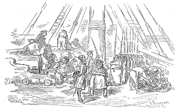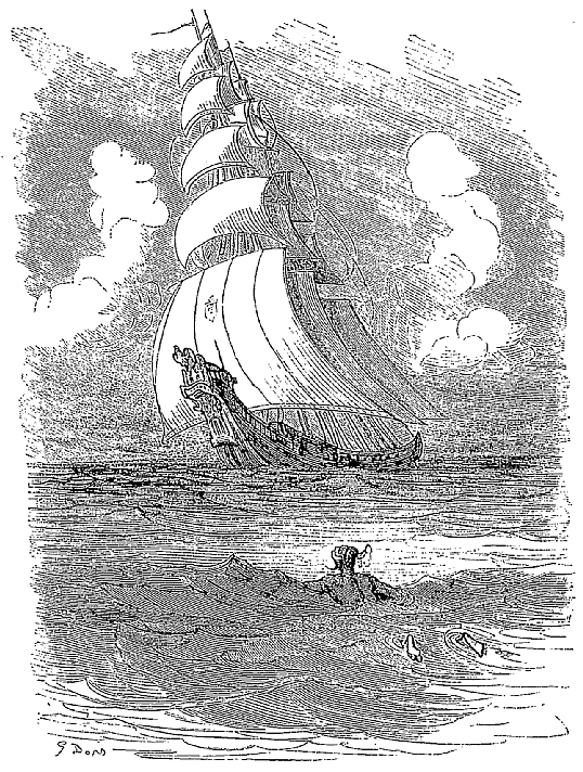 Après que nous eûmes passé quelque temps dans sa gueule, il la rouvrit pour engloutir une énorme masse d'eau: notre navire, soulevé par ce courant, fut entraîné dans l'estomac du monstre, où nous nous trouvions comme si nous eussions été à l'ancre pris d'un calme plat. L'air était, il faut en convenir, chaud et lourd. Nous vîmes dans cet estomac des ancres, des câbles, des chaloupes, des barques et bon nombre de navires, les uns chargés, les autres vides, qui avaient subi le même sort que nous. Nous étions obligés de vivre à la lumière des torches; il n'y avait plus pour nous ni soleil, ni lune, ni planètes. Ordinairement nous nous trouvions deux fois par jour à flot et deux fois à sec. Quand la bête buvait nous étions à flot, lorsqu'elle lâchait l'eau nous étions à sec. D'après les calculs exacts que nous fîmes, la quantité d'eau qu'elle avalait à chaque gorgée eût suffi à remplir le lit du lac de Genève, dont la circonférence est de trente milles.