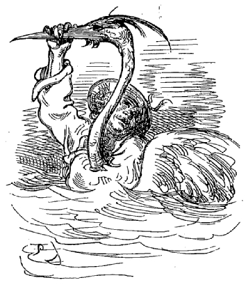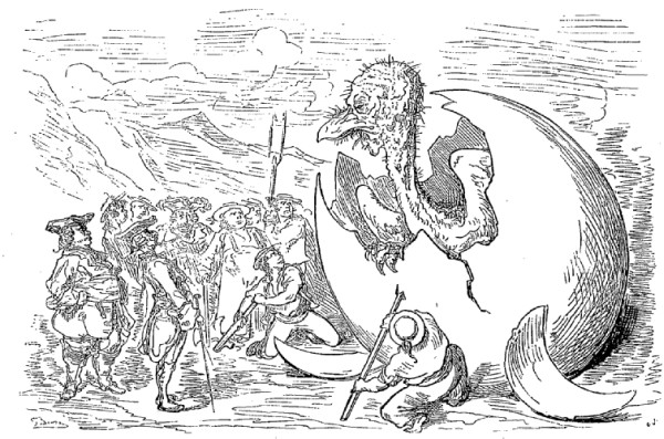 Nous remarquâmes entre autres un nid d'alcyons, dont la circonférence était cinq fois grande comme la coupole de Saint-Paul à Londres; il était artistement construit d'arbres gigantesques, et il contenait ...—attendez, que je me rappelle bien le chiffre!—il contenait cinq cents œufs dont le plus petit était au moins aussi gros qu'un muid. Nous ne pûmes pas voir les jeunes qui étaient dedans, mais nous les entendîmes siffler. Ayant ouvert à grand'peine un de ces œufs, nous en vîmes sortir un petit oiseau sans plumes, gros environ comme vingt de nos vautours. A peine avions-nous fait éclore le jeune oiseau que le vieux alcyon se jeta sur nous, saisit notre capitaine dans une de ses serres, l'enleva à la hauteur d une bonne lieue, le frappa violemment avec ses ailes et le laissa tomber dans la mer.