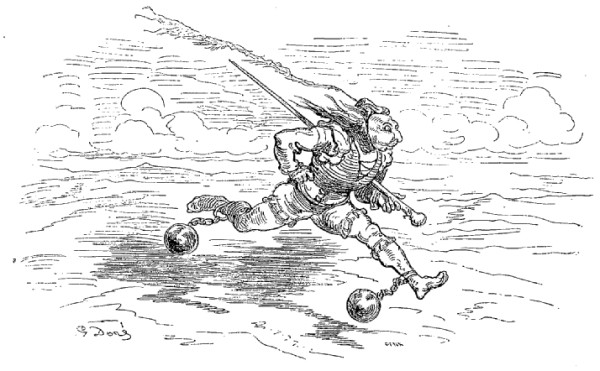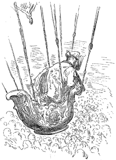 Je pouvais bien être encore à une distance de deux lieues de la terre, dans les nuages, lorsque la corde se cassa, et je tombai si rudement sur le sol, que j'en restai tout étourdi. Mon corps, dont le poids s'était accru par la vitesse acquise et par la distance parcourue, creusa dans la terre un trou d'au moins neuf pieds de profondeur. Mais la nécessité est bonne conseillère. Je me taillai avec mes ongles de quarante ans une sorte d'escalier, et je parvins de cette façon à revoir le jour.